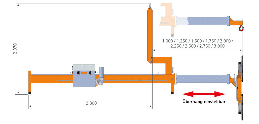 EinsatzHeben, Transportieren und Montieren von Elementen zu bzw. an schwer zugänglichen Bereichen (max. Überhang: 3.000 mm) im Innen- und Außenbereich