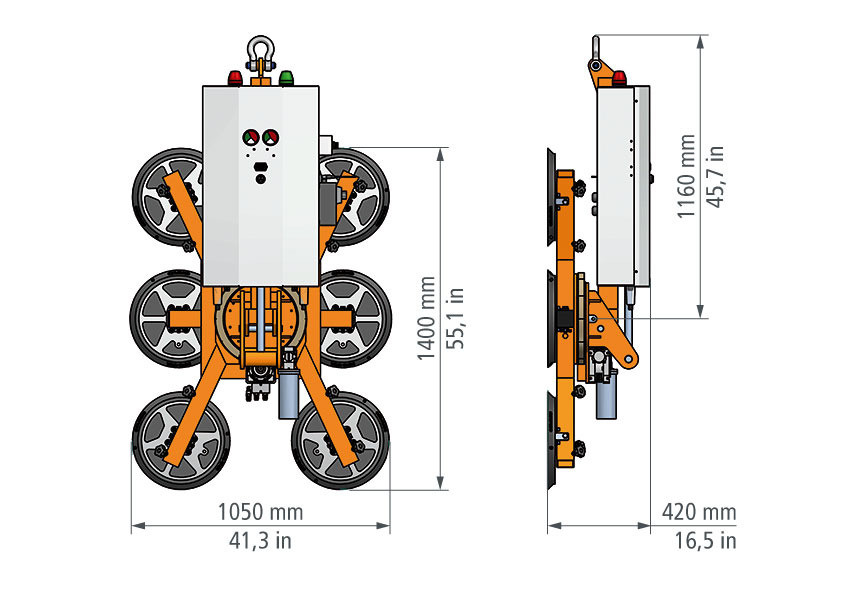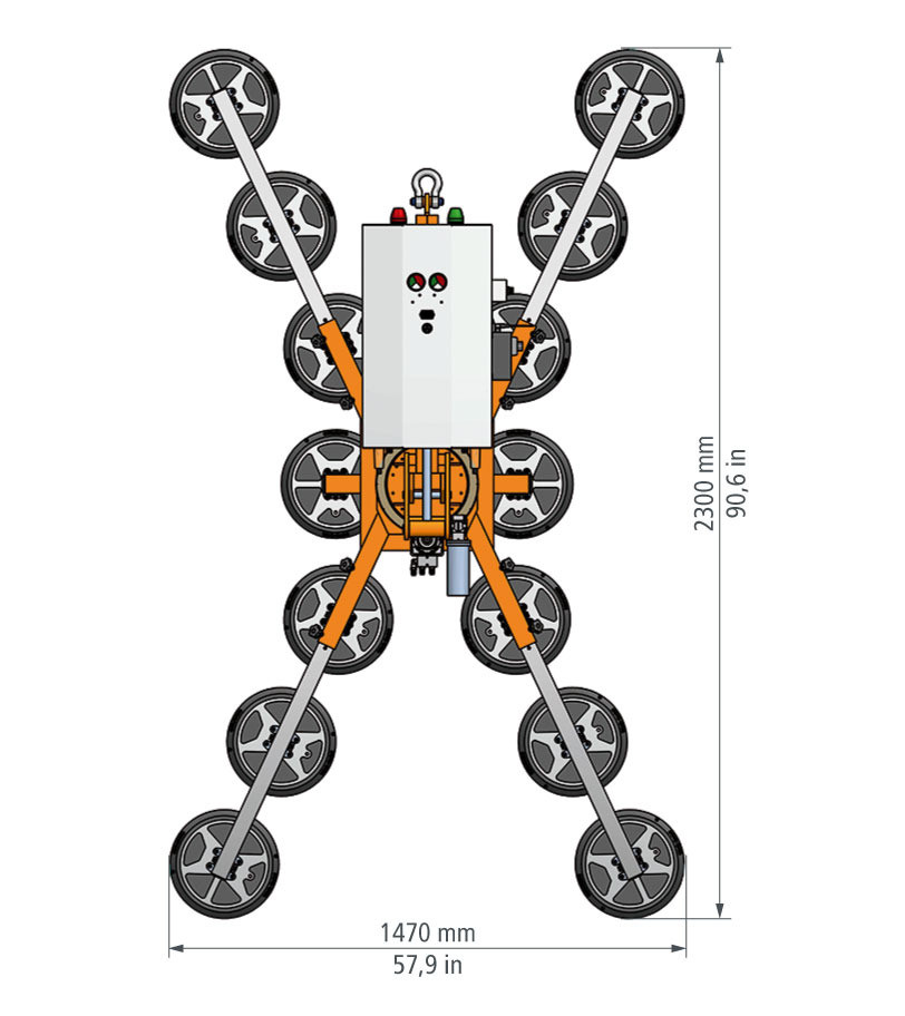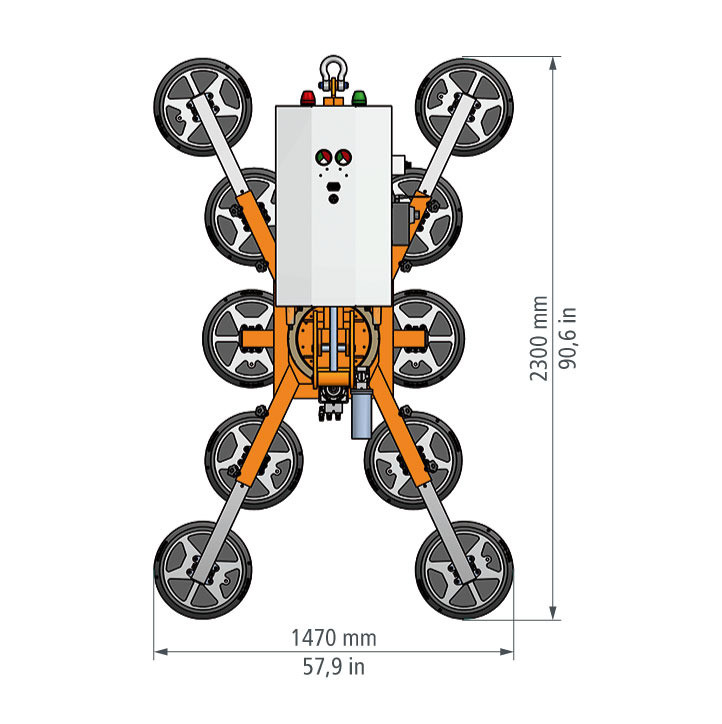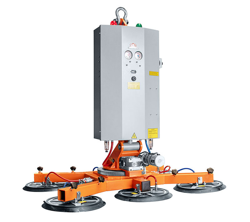 Die Lastaufnahmeöse des Gerätes ermöglicht das Einhängen in ein vorhandenes (kundenseitiges) Hebezeug. Der Saugrahmen kann elektromotorisch um 360° endlos gedreht und um 90° hydraulisch geschwenkt werden. Die Bedienung mittels Kabelfernsteuerung (optional Funkfernsteuerung) und die ergonomisch angeordneten Anzeige- und Signaleinrichtung gestatten ein komfortables Positionieren und Bewegen der Last.